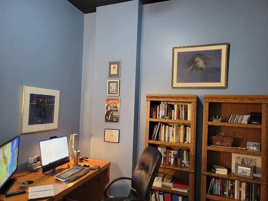 I love working here. It’s the office where I wrote and sold my memoir after retirement in April 2020 … proving that a mountain view isn’t absolutely necessary for writing inspiration.