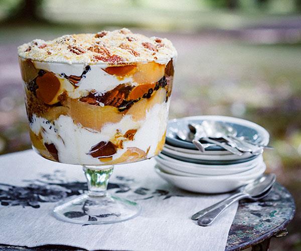 A photo of a proper trifle. Peter Gilmore’s quince, pecan and crème caramel trifle with honey cream, from the May 30, 2016, edition of Gourmet Traveller.