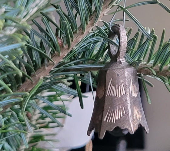 Below is the oldest ornament from my family’s collection. The brass bell, inscribed with INDI on the inside, was likely crafted in India. To the best of my recollection, it was a gift to my sister Marsha not long after her birth in 1943 in Buffalo, New York. Whatever the historic minutiae, I know it’s old.