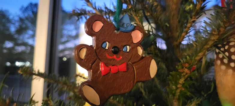 Speaking of Ted’s family, I love this ceramic Teddy-bear ornament, likely made by Ted’s mom or sister sometime after his college years.