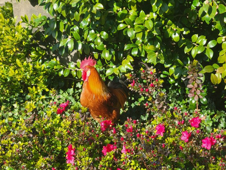 Roosters and peacocks roam freely.